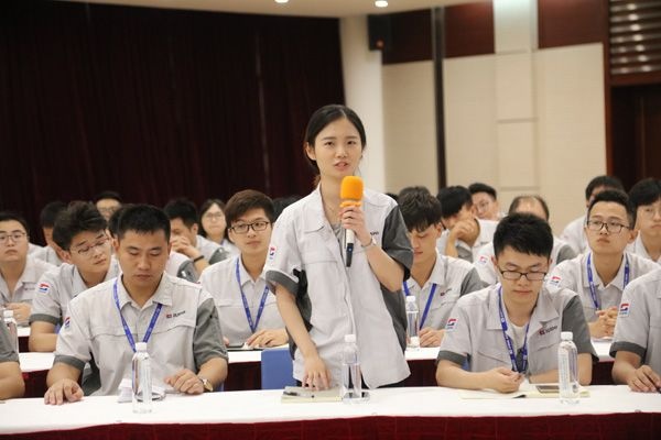 部门代表发言环节,产品研发中心副主任章建忠表示,新进大学生要尽快融入部门,完成角色转换,要干到实处。四分厂厂长陈国卫建议大学生要适应大环境,提升自我,善于发现并勇于抓住机会,也要强健身体,有好的身体才能更好地投身工作。六分厂厂长顾建定表示,欢迎各位大学生到六分厂培训学习,六分厂将竭尽全力培养每一位大学生,他建议大学生要在工作中积极主动,不耻下问,尽快提升自己。各位代表分享了自己十多年的工作经验,希望大家不忘初心,砥砺前行。